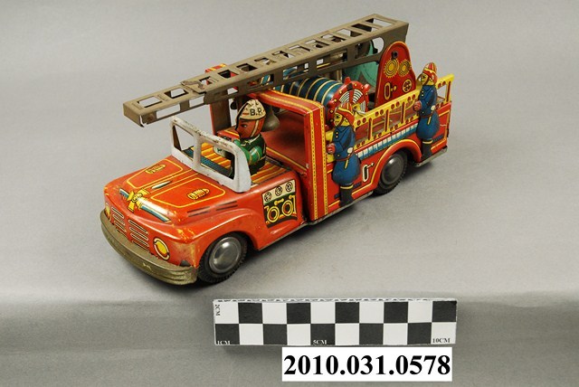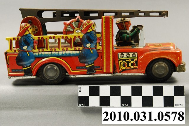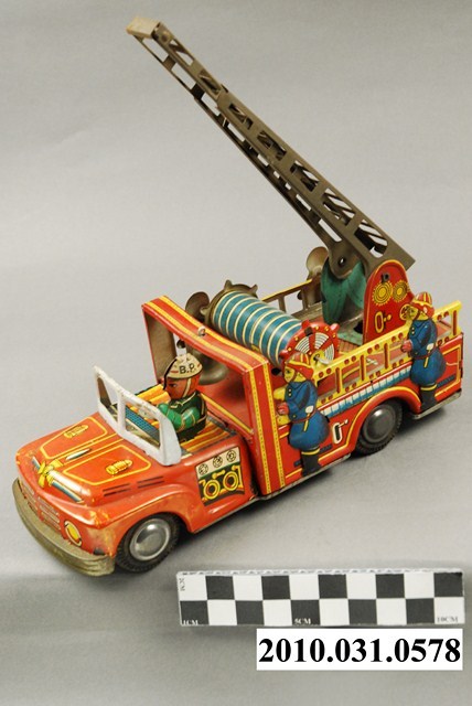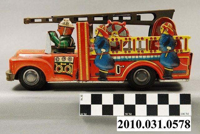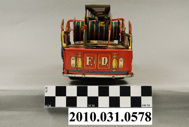 1.本物件為消防車鐵皮玩具,材質為金屬,整體造型是一輛消防車,車上有數名消防隊員。消防車車身以紅、黃、藍三色構成,主體為紅色、欄杆為黃色,有一人頭戴白色安全帽、身穿綠色制服坐在車輛前方駕駛車輛,其餘隊員頭戴紅色安全帽、身穿藍色制服精神抖擻地站在車上;車斗上有代表消防設備管線的藍色圓桶,以及備有可以拉高的雲梯:車底背部有著「F.D.」的字樣。