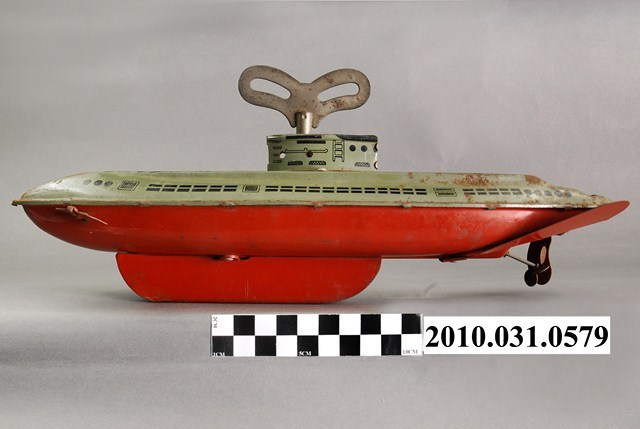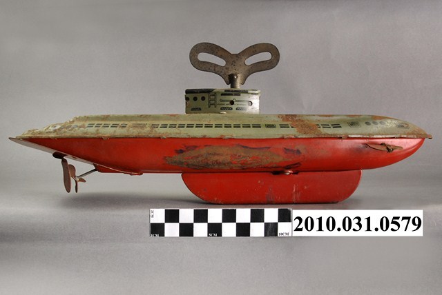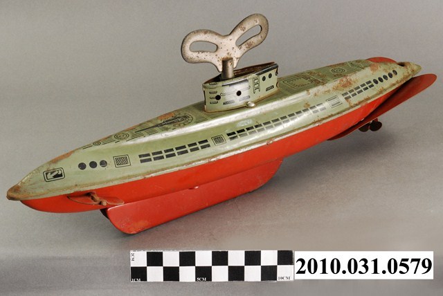 1.本物件為潛水艦鐵皮玩具,材質為金屬,整體造型是上端墨綠色,下端紅色的潛水艦,艦體似飛彈造型,繪有整排黑色四角形的小窗戶,艦體中間有發條,艦尾有螺旋槳。轉動發條,螺旋槳會轉動,可使潛水艦移動。