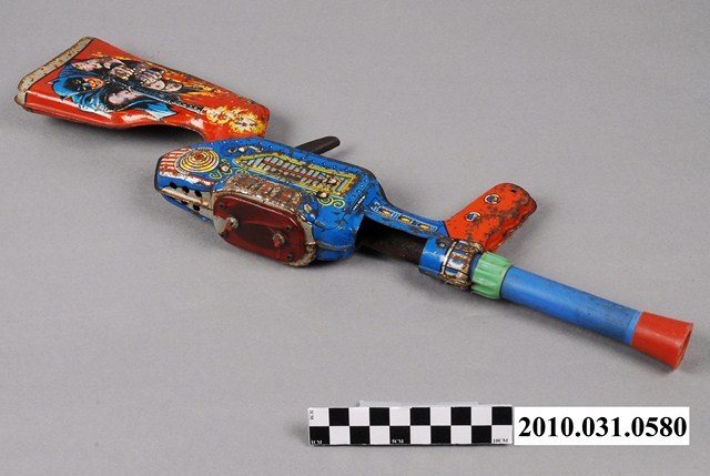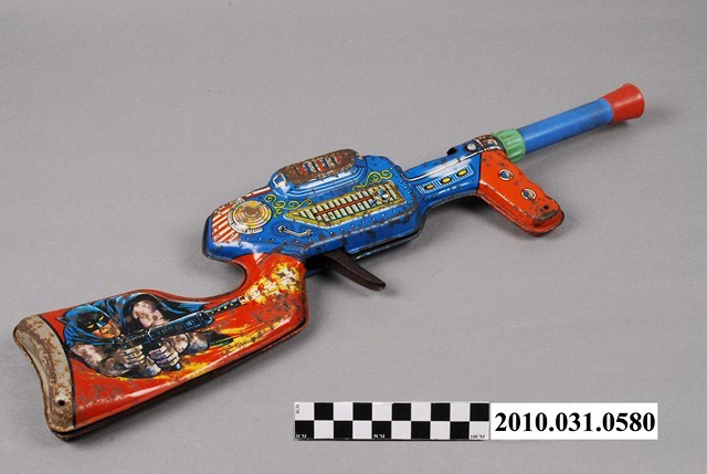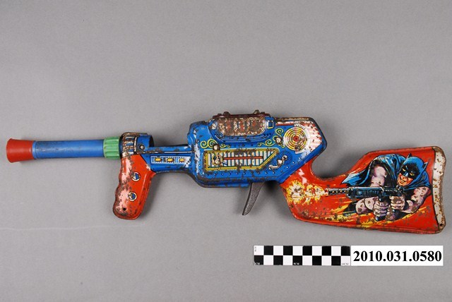 1.本物件為步槍鐵皮玩具,材質為金屬,整體造型是由紅、藍為主色的步槍,此步槍鐵皮玩具有著藍色槍管、紅色的避火罩、黑色的板機,槍身繪有彩色裝飾圖樣,紅色槍托則有蝙蝠俠拿著步槍掃射的圖樣。