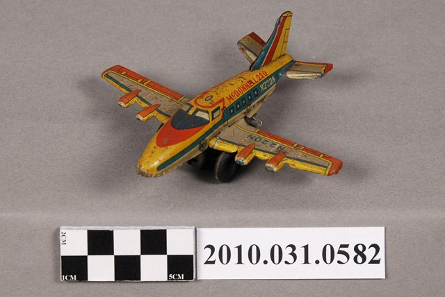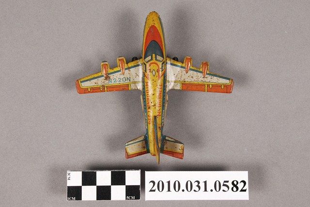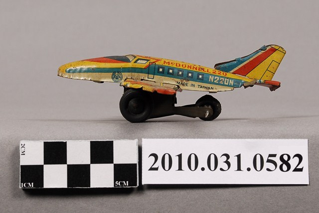1.本物件為飛機鐵皮玩具,材質為金屬,整體造型是以白色、黃色、墨綠色、紅色為主的飛機,飛機側身有五個窗戶,由上往下依序印著「M□DONNELL220」、「N220N」、「MADE IN TAIWAN」字樣。機翼與尾翼有黃、綠、紅三色,機身底部塗滿紅色,下方為起落架。