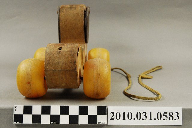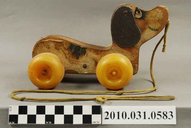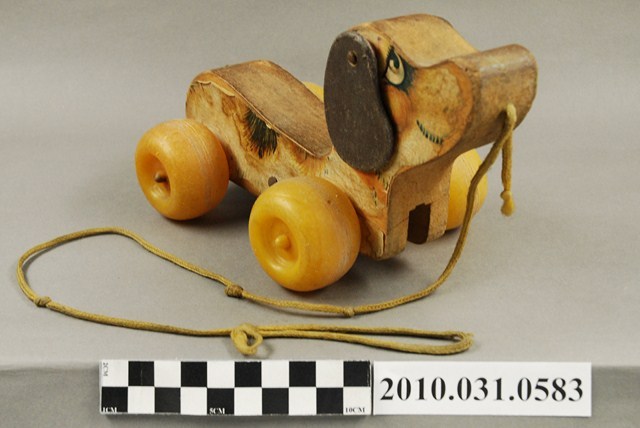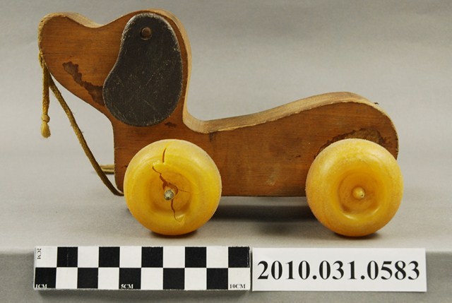 本物件為玩具狗,複合材質。該物件外觀為一隻狗與四個輪子。狗的身體為木頭材質,一側有彩繪眼睛、嘴巴、身體,另一側則為空白。四個輪子為黃色、塑膠材質。狗的嘴巴繫有一條棉繩。