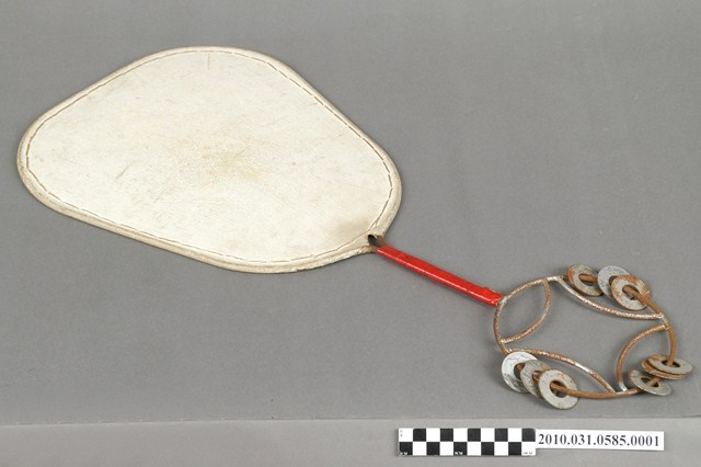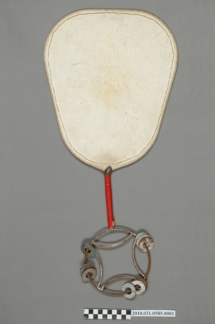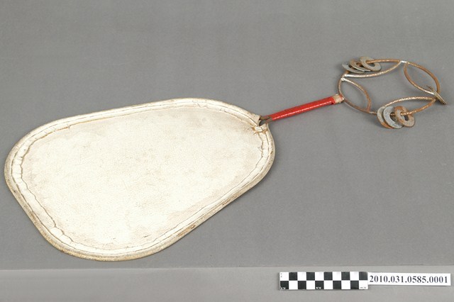 1.本物件為趕鳥拍,複合材質。扇子上方為上寬下窄的白色平面,下方握把處為紅色、並連接1個金屬圓環,圓環內部平均設有4條金屬線。圓環3側各設有3個空心金屬環,共有9個金屬環。整體外觀有使用痕跡。