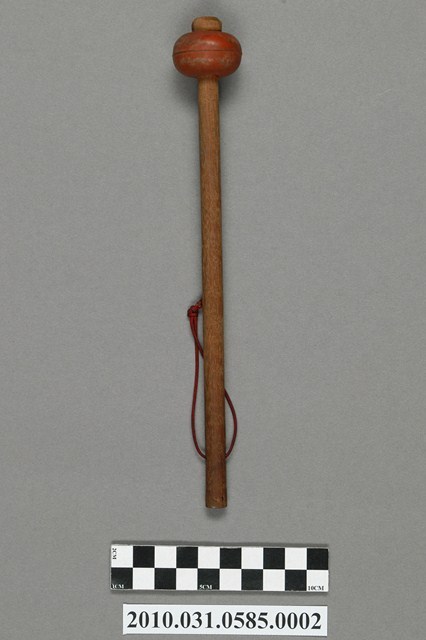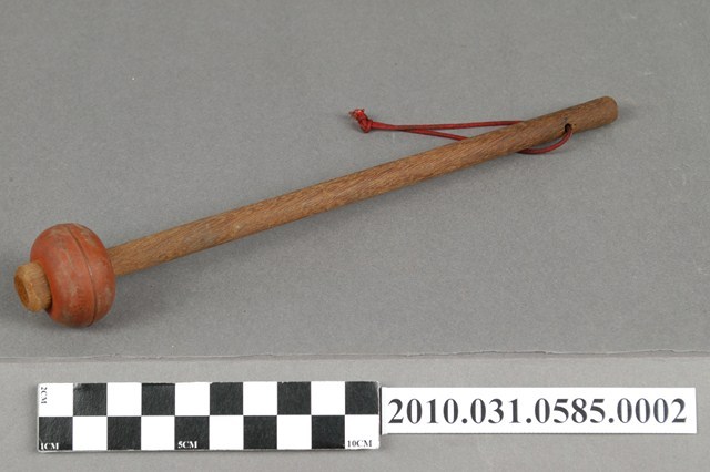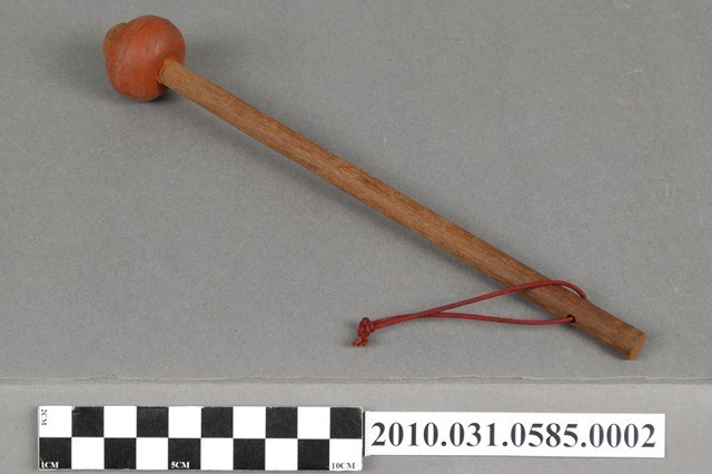 1.本物件為趕鳥拍棒,複合材質。該趕鳥拍棒上方設有朱紅色橢圓狀物品,下方繫有1條紅色尼龍繩。整體外觀有使用痕跡。