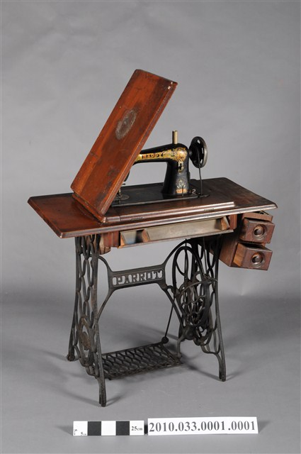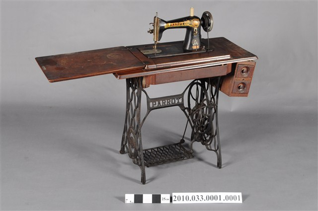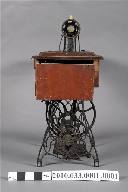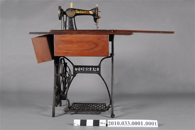 本文物為快樂牌腳踏式裁縫車,為黑色金屬材質,有一輪盤,若踩踏下方腳踏板,則其以槓桿原理使該裁縫機運作。1790年英國人湯瑪斯‧聖特(Thomas Saint)為提高製鞋效率設計手搖裁縫機,在多次的改良之下,時至1853年多數家庭使用之腳踏裁縫機才出現。而傳統家庭中的縫紉工作多由女性擔任,因此縫紉機出現反映女性生活與科技互動,所產生工作型態之改變。
