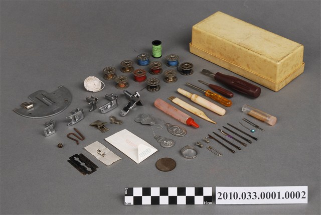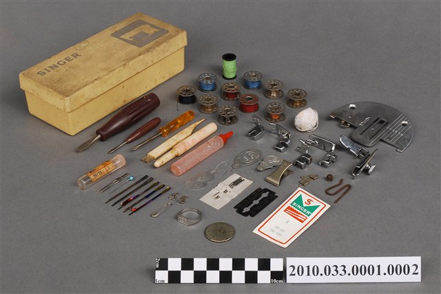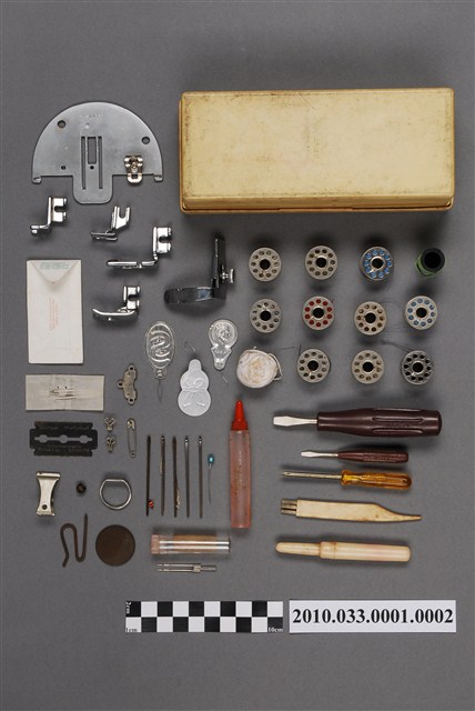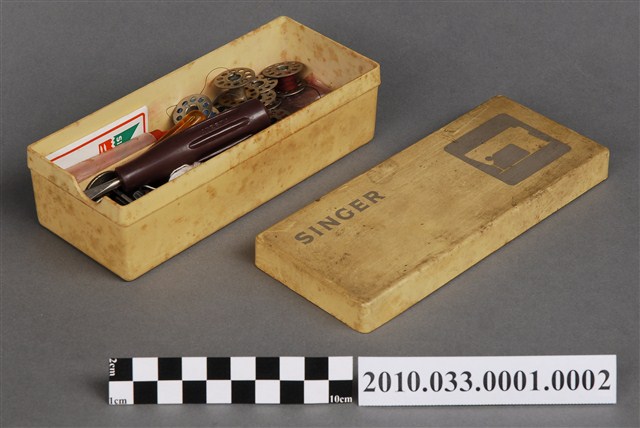 本文物為縫紉機工具組,外包裝為米白色長方形紙箱,裡面方著可以替換或修理縫紉機的工具。上蓋以灰色反白縫紉機圖案,左上角以灰色英文字母寫有「SINGER」的字樣。1790年英國人湯瑪斯‧聖特(Thomas Saint)為提高製鞋效率設計手搖裁縫機,在多次的改良之下,時至1853年多數家庭使用之腳踏裁縫機才出現。而傳統家庭中的縫紉工作多由女性擔任,因此縫紉機出現反映女性生活與科技互動,所產生工作型態之改變。