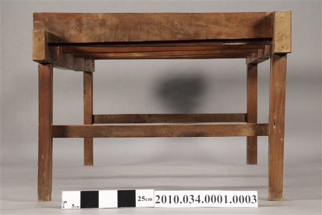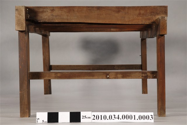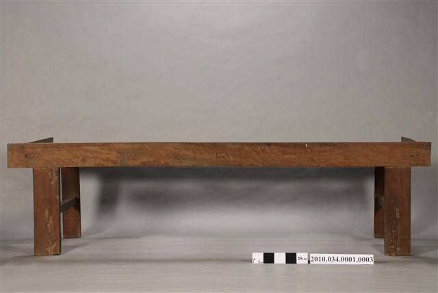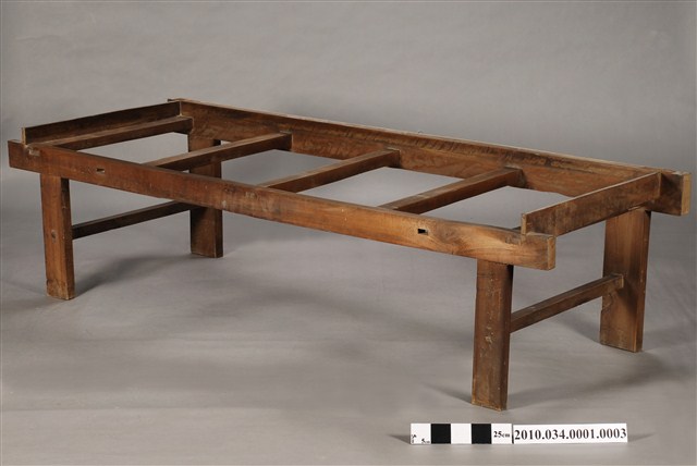本件為洋風八腳紅眠床之後床腳,長200公分、寬71公分、高53公分,四足上端有四橫棖用以承接床板,後方上端與前方各有兩榫孔用以連接其他組件。通體不施漆,不做裝飾。本件與前床腳組合成紅眠床的底部,透過榫卯連結形成八腳的底座。