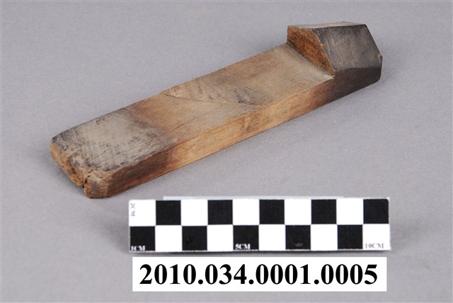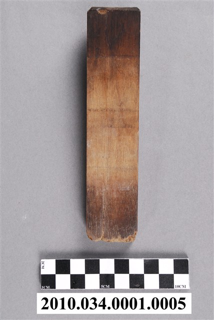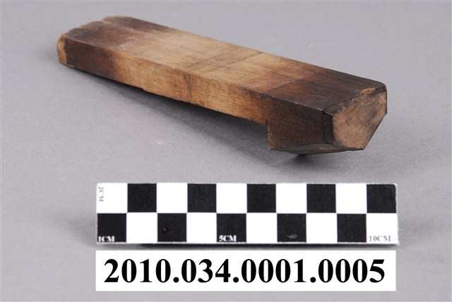 本件為洋風八腳紅眠床之床腳連結左側插梢,長3.4公分、寬2.8公分、高15.5公分,為一根長方形木材雕成,尖端成五角形突出,用來插入榫孔,固定連接前後床腳。通體不施漆,不做裝飾。