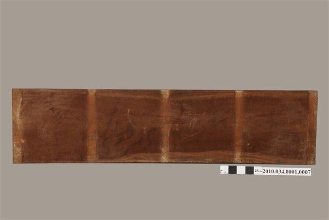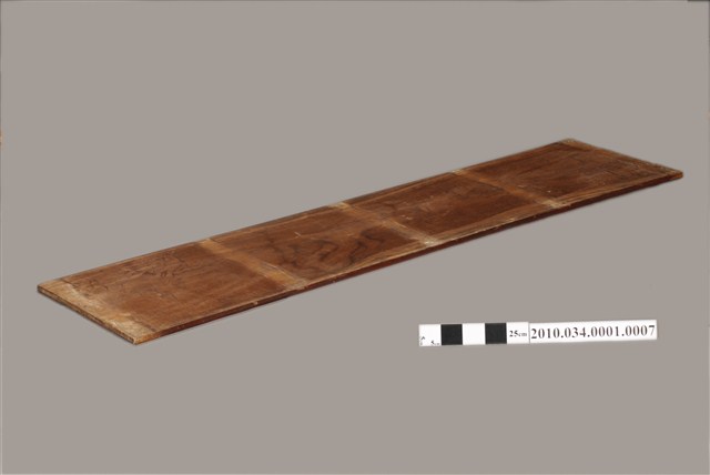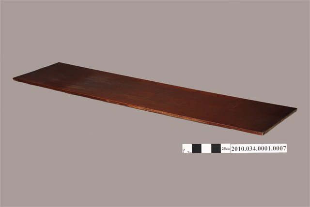 本件為洋風八腳紅眠床之中間床板,為3塊床板之一,長184公分、寬45.5公分、高1.5公分。整體為一塊木板製成,正面施紅漆,背面不施漆,背面可見連接床腳底座之痕跡。
