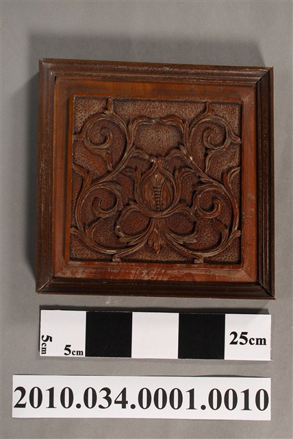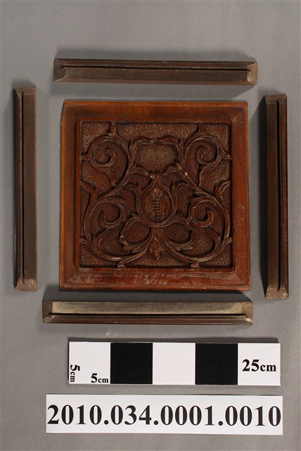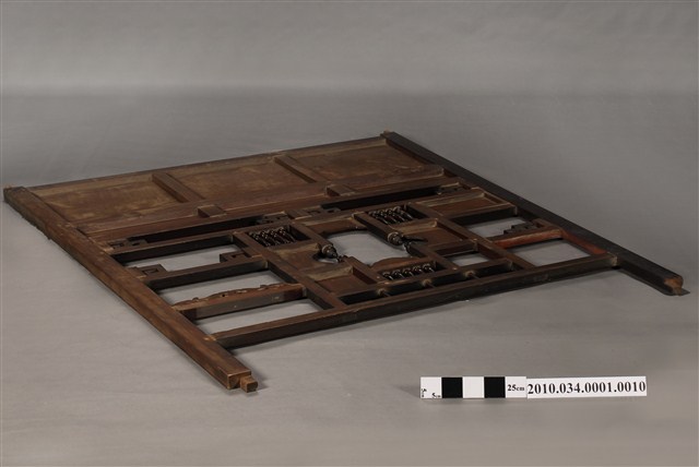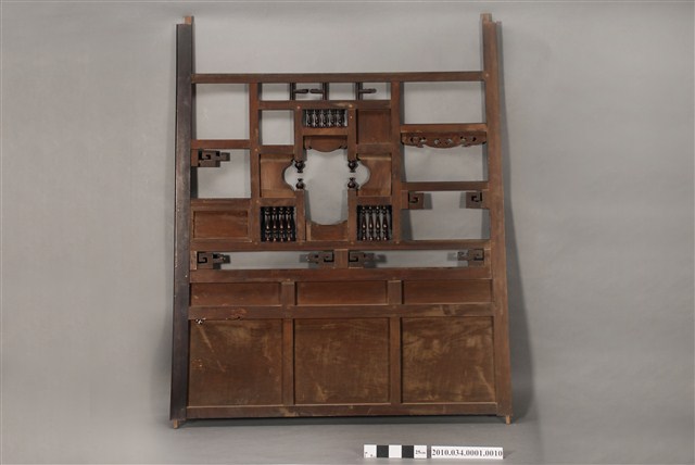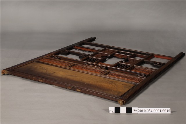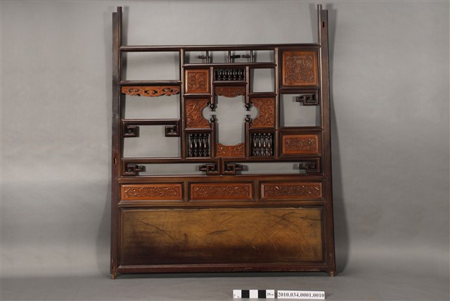 1. 本件為洋風八腳紅眠床之右遮風,長147公分、寬176公分、高4公分。前後兩根床柱,上下各做有榫頭,床柱內部有卯孔,用以連接其他部件。床柱之間可分為上中下三層,上層又可分為前中後三部分,前半部為三層板面,上下為實木淺浮雕之洋風花草紋板堵,中央透空,框架做有迴轉紋掛勾。中間部上層為卜形掛勾,中層為亞字型框架,中間透空,周邊以車枳欄杆、洋風淺浮雕花草紋板堵圍繞。後半部為三層透空,僅中間部分以類似建築員光的 鏤空雕刻。中層上為三並列透空框架,做迴轉紋掛勾,下為三板堵,上有淺浮雕洋風花草紋。最下層為一無裝飾板堵。內面施以生漆,外面不施漆。