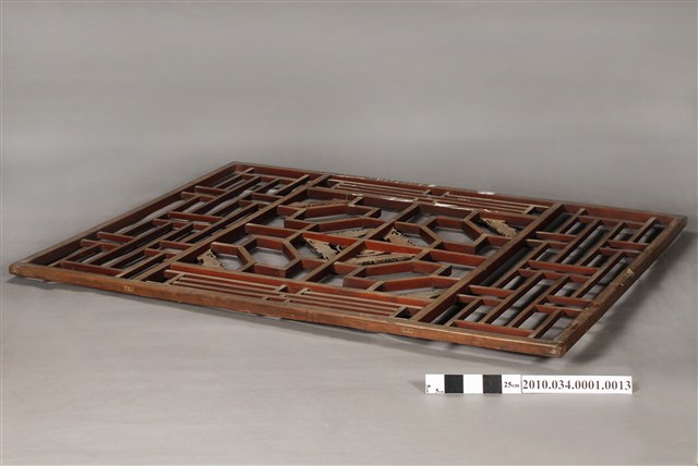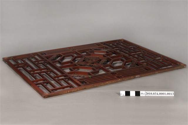 本件為洋風八腳紅眠床之床頭屜櫃,長183.5公分、寬138公分、高6公分。整體以方形長條木材組成,分為前中後三部,前後部皆為變形連續盤長紋,以縱橫交錯的木條組成。中間部分則分為左中右,左右同樣為變形連續盤長紋,中間部分則為八角形龜甲紋,中央為圓形前浮雕鶴紋,四方側邊則為蝙蝠紋,具有賜福吉祥如意等寓涵。內面施以生漆,外面不施漆。