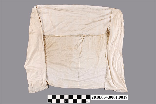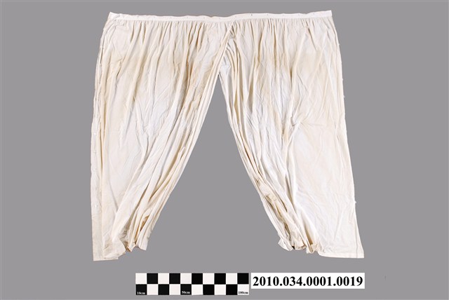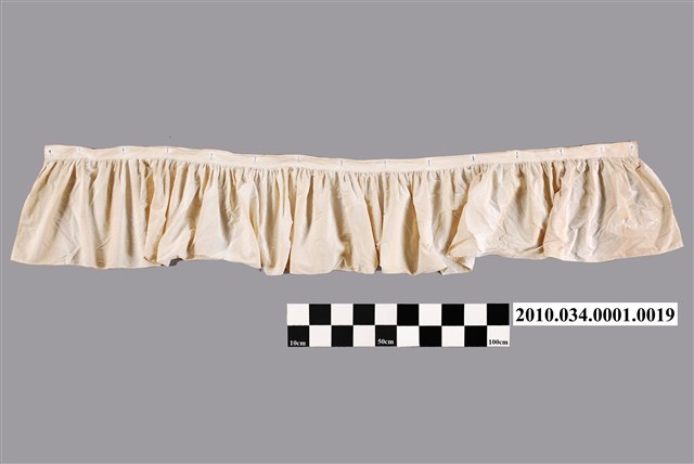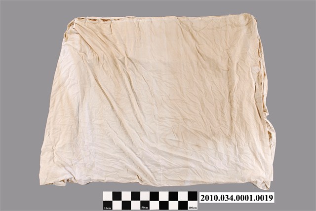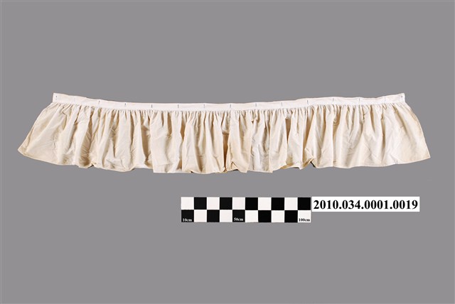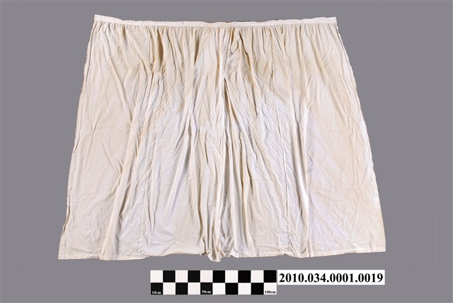 本件為洋風八腳紅眠床外表覆蓋之床簾布幔,米白色棉布,正前方有交叉開口,方便出入。