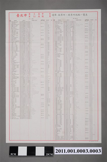此物件標題為「臺北市第5屆市長 第11屆議員選舉選舉公報 」(松山、信義選區),投票日期為2010年11月27日,編印單位為臺北市選舉委員會。此物件為雙面印刷,正、反面分別議員候選人名單及其學經歷、政見,以及選舉投、開票所地點。 2010年11月27日舉辦的中華民國直轄市市長暨市議員選舉、中華民國直轄市里長選舉,實施範圍包含當時新形成的5個直轄市:臺北市、新北市、臺中市、臺南市及高雄市。是次選舉,對於臺北市之外的其餘四者而言,皆為改制或區域合併後的首次地方公職選舉,大眾媒體普遍以「五都選舉」稱之,此次五都選舉的結果為:臺北市:郝龍斌、新北市:朱立倫、臺中市:胡志強、臺南市:賴清德、高雄市:陳菊,其中臺北、新北、臺中市長由中國國民黨取得,臺南、高雄市長由民主進步黨取得。 1945年國民政府接收臺灣,並公布一系列關於地方自治的行政命令,如:《臺灣省各級民意機關成立方案》、《臺灣省各縣市實施地方自治綱要》等。此時期,地方政府相對欠缺資源,且無法對上級政府提起訴願或行政訴訟,受到中央政府管制。此狀況一直持續到1990年,在「三月學運」、「國是會議」所催化的一系列的憲政改革之後,才開始改變。後在1999年《地方制度法》發佈後,地方自治方得以正式落實。