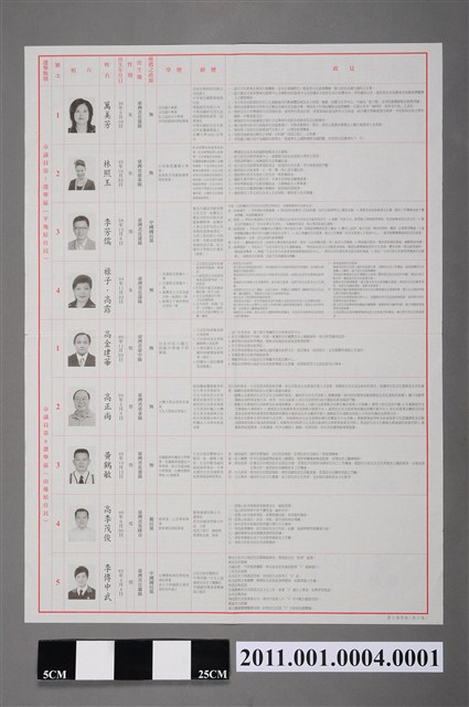 此物件標題為「臺北市第5屆市長 第11屆議員選舉選舉公報 」(中正、萬華選區),投票日期為2010年11月27日,編印單位為臺北市選舉委員會。此物件為雙面印刷,正、反面分別羅列市長、議員候選人名單及其學經歷、政見。 2010年11月27日舉辦的中華民國直轄市市長暨市議員選舉、中華民國直轄市里長選舉,實施範圍包含當時新形成的5個直轄市:臺北市、新北市、臺中市、臺南市及高雄市。是次選舉,對於臺北市之外的其餘四者而言,皆為改制或區域合併後的首次地方公職選舉,大眾媒體普遍以「五都選舉」稱之,此次五都選舉的結果為:臺北市:郝龍斌、新北市:朱立倫、臺中市:胡志強、臺南市:賴清德、高雄市:陳菊,其中臺北、新北、臺中市長由中國國民黨取得,臺南、高雄市長由民主進步黨取得。 1945年國民政府接收臺灣,並公布一系列關於地方自治的行政命令,如:《臺灣省各級民意機關成立方案》、《臺灣省各縣市實施地方自治綱要》等。此時期,地方政府相對欠缺資源,且無法對上級政府提起訴願或行政訴訟,受到中央政府管制。此狀況一直持續到1990年,在「三月學運」、「國是會議」所催化的一系列的憲政改革之後,才開始改變。後在1999年《地方制度法》發佈後,地方自治方得以正式落實。