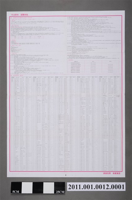此物件標題為「新北市第1屆議員選舉選舉公報」(第4選舉區),投票日期為2010年11月27日,編印單位為臺北市選舉委員會。此物件共計兩面,羅列候選人名單及其學經歷、政見,以及投票地點、投票規範。 2010年11月27日舉辦的中華民國直轄市市長暨市議員選舉、中華民國直轄市里長選舉,實施範圍包含當時新形成的5個直轄市:臺北市、新北市、臺中市、臺南市及高雄市。是次選舉,對於臺北市之外的其餘四者而言,皆為改制或區域合併後的首次地方公職選舉,大眾媒體普遍以「五都選舉」稱之,此次五都選舉的結果為:臺北市:郝龍斌、新北市:朱立倫、臺中市:胡志強、臺南市:賴清德、高雄市:陳菊,其中臺北、新北、臺中市長由中國國民黨取得,臺南、高雄市長由民主進步黨取得。 臺灣的縣市議員選舉始於日治時代,在1935年6月臺灣總督府發佈《市會議員及街庄協議會員選舉規程》後,在該年的11月22日舉行全臺第一次地方民意代表選舉,此次選舉,選出的民意代表官選、民選各半,而選出來之議員僅具議決權,不具有提案、質詢等權責。後在國民黨政府派員接收臺灣後,1945年臺灣行政長官公署公布「臺灣省各級民意機關成立方案」,並於1946年辦理間接選舉產生縣市參議員。而在1950年,舉辦了第1屆民選的縣市議員選舉,臺灣民眾得以選出為自身權益喉舌的議員。