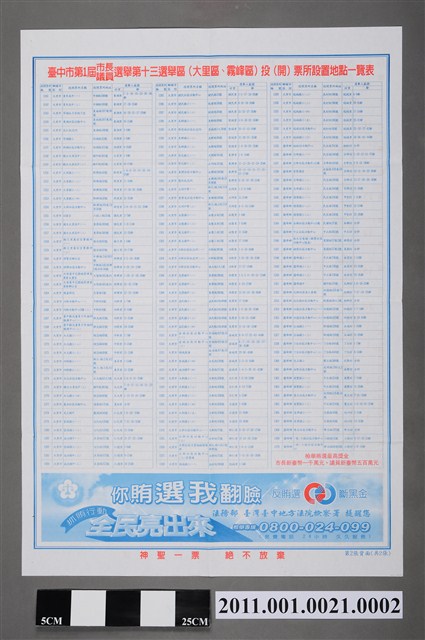 此物件標題為「臺中市第1屆市長、議員選舉選舉公報」(第13選舉區 大里、霧峰),投票日期為2010年11月27日,編印單位為臺中市選舉委員會,此物件於正面羅列候選人名單及其學經歷、政見,反面刊載投票開票所地點一覽表。 2010年11月27日舉辦的中華民國直轄市市長暨市議員選舉、中華民國直轄市里長選舉,實施範圍包含當時新形成的5個直轄市:臺北市、新北市、臺中市、臺南市及高雄市。是次選舉,對於臺北市之外的其餘四者而言,皆為改制或區域合併後的首次地方公職選舉,大眾媒體普遍以「五都選舉」稱之,此次五都選舉的結果為:臺北市:郝龍斌、新北市:朱立倫、臺中市:胡志強、臺南市:賴清德、高雄市:陳菊,其中臺北、新北、臺中市長由中國國民黨取得,臺南、高雄市長由民主進步黨取得。 1945年國民政府接收臺灣,並公布一系列關於地方自治的行政命令,如:《臺灣省各級民意機關成立方案》、《臺灣省各縣市實施地方自治綱要》等。此時期,地方政府相對欠缺資源,且無法對上級政府提起訴願或行政訴訟,受到中央政府管制。此狀況一直持續到1990年,在「三月學運」、「國是會議」所催化的一系列的憲政改革之後,才開始改變。後在1999年《地方制度法》發佈後,地方自治方得以正式落實。