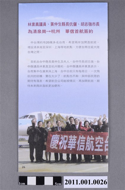 此物件為選舉文宣,所欲宣傳的人物為臺中市議員林素真,此文宣以小冊形式印製,列舉林素真議員任內問政事績。 本件所提及的候選人林素真曾任大甲鎮民代表、臺中縣議員,她於2010年代表中國國民黨參選臺中市議員落選,而後在2014年再度參選,因同選區議員當選人涉嫌賄選而遞補上任,又因自身賄選案件遭判刑,前述遞補當選無效。 2010年11月27日舉辦的中華民國直轄市市長暨市議員選舉、中華民國直轄市里長選舉,實施範圍包含當時新形成的5個直轄市:臺北市、新北市、臺中市、臺南市及高雄市。是次選舉,對於臺北市之外的其餘四者而言,皆為改制或區域合併後的首次地方公職選舉,大眾媒體普遍以「五都選舉」稱之,此次五都選舉的結果為:臺北市:郝龍斌、新北市:朱立倫、臺中市:胡志強、臺南市:賴清德、高雄市:陳菊,其中臺北、新北、臺中市長由中國國民黨取得,臺南、高雄市長由民主進步黨取得。
