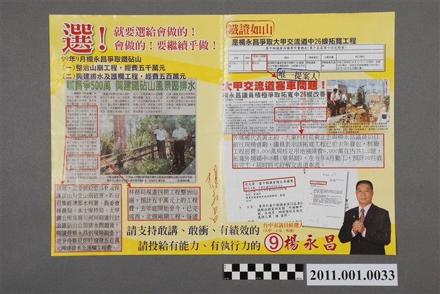 此物件為選舉廣告,為楊永昌於2010年參選臺中市議員時所印製。廣告主旨為「選!就要選給會做的!會做的!要繼續乎做!」,正、反兩面以刊載報紙縮圖的形式展示楊永昌問政事蹟。 本件所提及的候選人楊永昌曾任大甲鎮民代表、臺中縣議員,2010年以無黨籍身份當選臺中市議員。楊永昌於2014年競選連任成功,但因賄選遭判當選無效。 2010年11月27日舉辦的中華民國直轄市市長暨市議員選舉、中華民國直轄市里長選舉,實施範圍包含當時新形成的5個直轄市:臺北市、新北市、臺中市、臺南市及高雄市。是次選舉,對於臺北市之外的其餘四者而言,皆為改制或區域合併後的首次地方公職選舉,大眾媒體普遍以「五都選舉」稱之,此次五都選舉的結果為:臺北市:郝龍斌、新北市:朱立倫、臺中市:胡志強、臺南市:賴清德、高雄市:陳菊,其中臺北、新北、臺中市長由中國國民黨取得,臺南、高雄市長由民主進步黨取得。