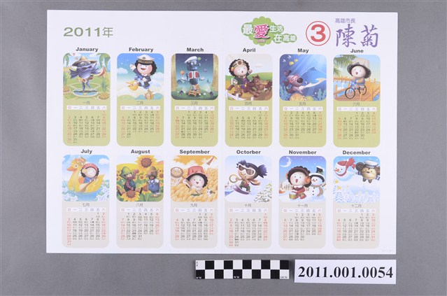 本文物為高雄市長候選人3號陳菊「幸福新高雄教育政見」選舉文宣, 內容提及「建構友善校園」、「打造體育新郡」、「推動創新教育」、「接軌國際教育」、「推動鄉土教學」、「落實弱勢關懷」、「縮短城鄉落差」、「精進教師專業」、「擴大志工保障」、「加強幼兒照護」、「補助營養午餐」等十點。背面為以陳菊的擬態人物花媽為主題的2011年造型月曆。陳菊1950年6月出生於宜蘭三星鄉,1979年美麗島事件的參與者,以自由和民主為信念,與呂秀蓮、林義雄等18人共創民主進步黨,曾任高雄市政府社會局局長、行政院勞工委員會主委、高雄市長等職。
