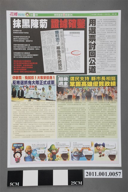 本文物為〈花媽報報〉第6期, 為2010年11月14日至27日陳菊競選高雄市長的競選總本部陳菊之友會所發行,是免費贈閱的報紙。由上角有競選活動的預告,下方報導「陳菊拚過半鄉親總動員」、「抹黑陳菊證據確鑿」、「用選票討回公道」等新聞,則是競選總部為陳菊的政治立場進行辯護和宣傳的報導。陳菊1950年6月出生於宜蘭三星鄉,1979年美麗島事件的參與者,以自由和民主為信念,與呂秀蓮、林義雄等18人共創民主進步黨,曾任高雄市政府社會局局長、行政院勞工委員會主委、高雄市長等職。
