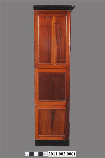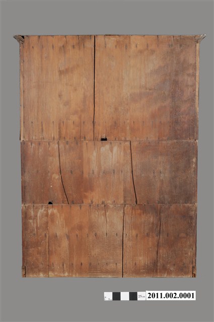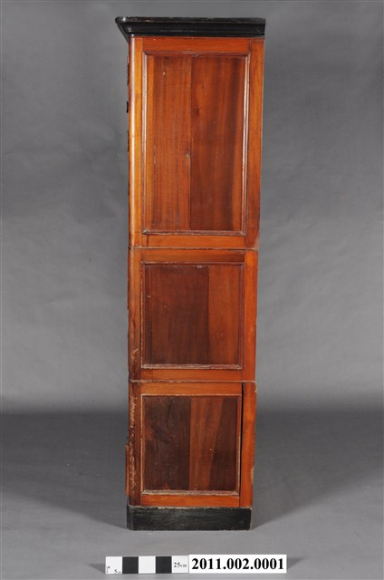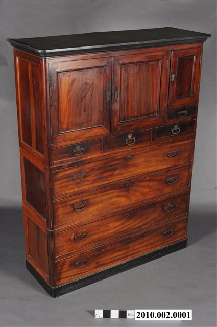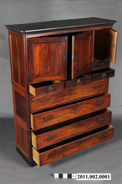本件為清漆木衣櫃,整體成方形,有簷頂,底部無足,直接落地。櫃體可分為三部分,上部分為左右兩區,左區較大,為對開櫃子,右區較小,上方為單拉門櫃子,下方則有一小抽屜。中間部分較矮,為三個並列小抽屜。下部份則為四層大抽屜。櫃門皆有金屬鐘形拉把,抽屜則有橢圓金屬拉把,中間及底部抽屜皆有鎖孔。櫃體施以清漆,頂部與底部則塗上黑漆,背部與內部不上漆,背面可見釘子眼接合痕跡。整體簡單無裝飾,給人簡潔實用之感。