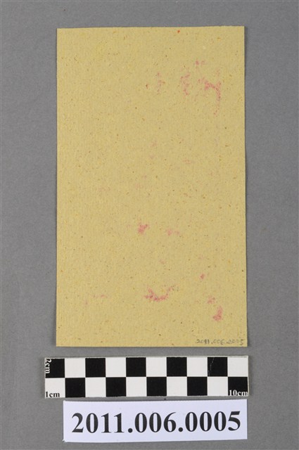 本件五鬼錢紙錢採直幅構圖,以朱紅色版印製於土黃色草紙上。紙錢以粗線為外框,上下有缺損,在上方框內橫書「五鬼錢」三字,下方框內立有五鬼形象,分為上下兩列,皆頭長犄角,赤裸上身。上列三位鬼卒正身站立,下列兩名鬼卒相對,外手上舉,內腳前伸。本件為宜蘭羅東共和發金紙店於日治時期所刻製的木雕印版,重新刷印。