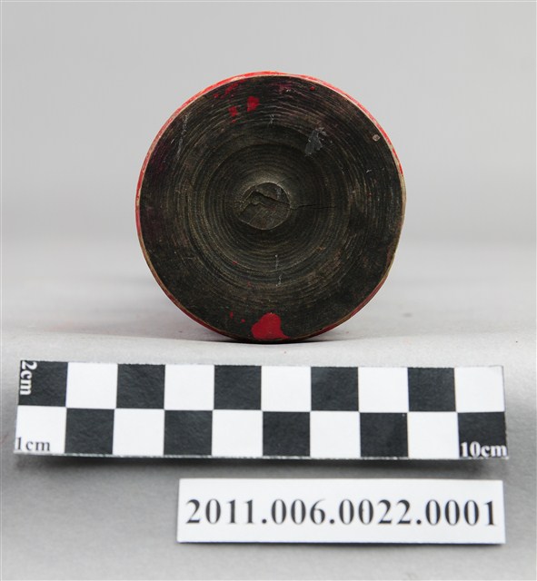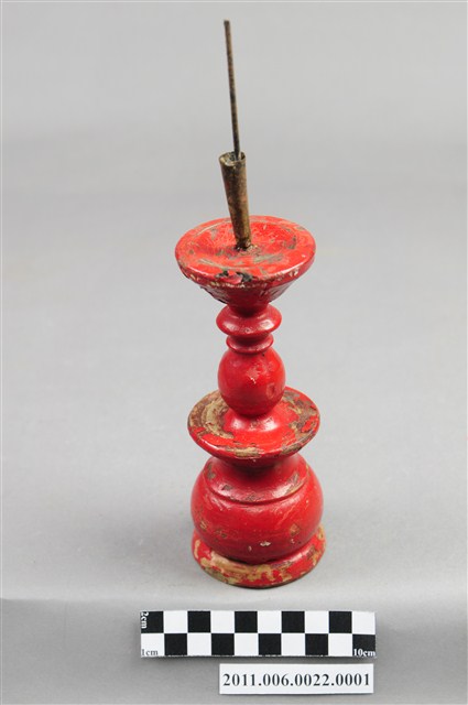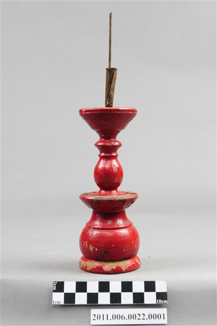 1.本件為木製燭臺,壺身造型,整體上紅漆,局部已剝落。金屬燭釺(燭針)歪斜,略見插燭使用痕跡。2.燭臺是安置蠟燭以祭祀神祇、祖先的禮器。分成祭祀、儀式用具和一般室內用具兩種,前者形體較大,工藝精緻,成對配置,如龍鳳燭臺、壽字燭臺;後者形式樸實,講究實用為主,不拘奇偶數。燭臺材料多見錫、陶、瓷、銅、木等等。