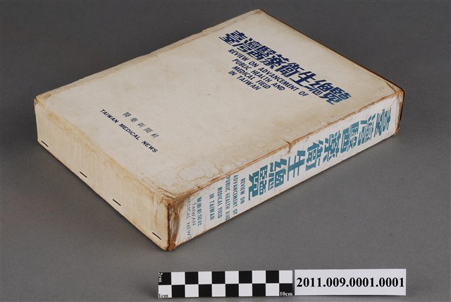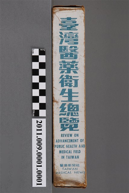 本物件為醫藥新聞社臺灣醫藥衛生總覽之封套,材質為紙質,醫藥新聞社臺灣醫藥衛生總覽的封套正面為白色,由上而下印有藍字「臺灣醫藥衛生總覽REVIEW ON ADVANCEMENT OF PUBLIC HEALTH AND MEDICAL FIELD IN TAIWAN」、與「醫藥新聞社 TAIWAN MEDICAL NEWS」;側面印刷同於正面,呈現縱向;背面由上而下印有「Solcoseryl」與「Reptilase Ambredi Solchepsy」。