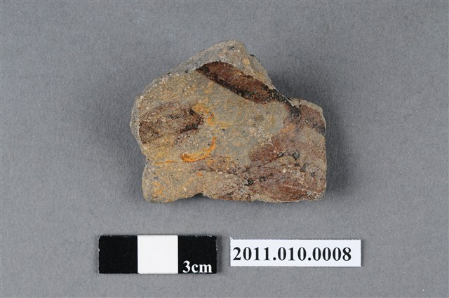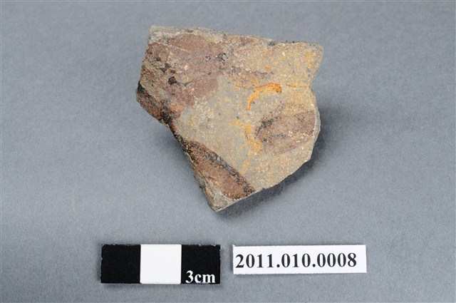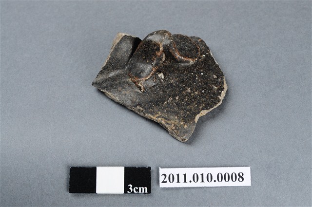 本件為2000年劉鵠雄先生臺北縣淡水鎮埤島橋遺址採集四繫黑釉罐殘片,約為口緣轉折處連接罐耳之處,橫式耳,斷面可見灰色胎裡。年代推測約屬臺灣北部十三行文化中期埤島橋類型,約距今1000-600年前。