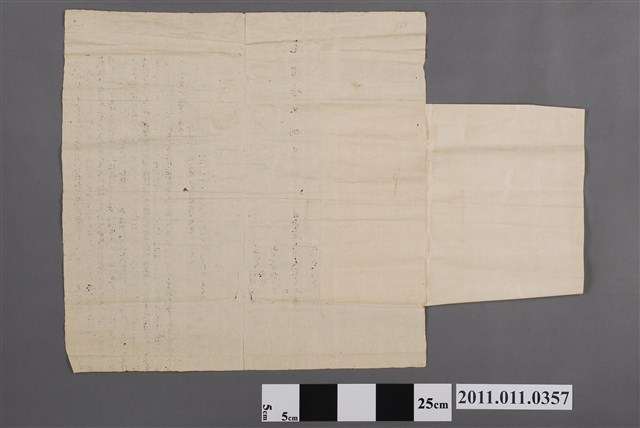 此為光緒10年(1884)8月的契頭及明治35年(1902)2月的契尾。臺邑郡(臺南府城)大東門外仁和里德高厝社劉文煌文鎚文旺等,將園典與郡大西門外試經口蘇貞源,價格六八秤銀200大員。契尾詳載這契頭之日本時代調查後之地址。如座落為臺南廳保西里溪埔墘庄土名上帝廟後洋呂字各號,並說明典的金額及稅金為2元,有趣的是把當初的大員都等同於日圓。(契頭全文如下)仝立典契字人臺邑郡大東門外仁和里德高厝社劉文煌、鎚、旺等,有承先父下之田壹叚,受種壹甲伍分,帶埤水參翻半灌溉,年納課粟捌石貳斗伍升整,勻丁照配,其田大小共捌坵,座落保西下里,土名上帝廟後洋番仔車路,東至贊家田,西至大路掘墘,南至許家田,北至郭家田,又至朱王二家田,四至明白為界。今因先父在日生理不就,積欠借項乏銀還項,愿將此田捌坵出典抵還借項,先盡問房親叔兄弟侄人等不能承受,外托中引就,向與郡大西門外試經口蘇貞源出頭承典,三面言議時價於足秤銀貳佰大元,其銀即日仝中交訖,其田隨即踏明,界址交付銀主前去掌管招佃耕作,收成納課。限至參年終為滿,聽典主偹足面銀贖回原契,銀主不得刁難,如至期無銀可贖,仍聽銀主再執掌管,不敢阻當生端異言滋事。保此田果係是鎚等承先父之業,與別房親人等無干,亦無重張典借他人財物為碍,以及交加來歷不明等情,如有不明等情,鎚等自出頭抵當,不干銀主之事。此係二比甘愿,各無反悔,口恐無憑,今欲有憑,合立契字壹紙,並帶連上手契壹紙合共貳紙,付執存照。 即日仝中收過來六八足秤銀貳佰大員完足,再照。 一,批明林郭二家契合在仁德北里契內,不得帶連,又照。 為中人劉朝選、吳廷均 知見人母鄭氏 光緒拾年捌月日仝立典契字人劉文煌、鎚、旺 代書人劉萬青(契尾全文如下)契尾壹七 契尾番號:壹七。 契約年月日:光緒十年八月。 種目:質入。 質入人住所氏名:台南縣仁和里竹戈厝庄劉文煌、文鎚、文旺。 質取人住所氏名:台南市街第五區試經口街三十三番戶,蘇貞源ノ事蘇蘊白。 事項: 位置:台南廳保西里青埔號墘庄土名上帝庙後洋,呂字四八二○、四八二三、四八二四、四八二五、四八二七号。 目的物:下則田五坵,計壹甲參分八毛弍絲弍忽,小租權。 金額:弍百円,地租金四円七拾八錢六毛。 稅金:弍円。 明治三十年律令第四號契稅規則ニ由リ此契尾ヲ授與ス 明治卅五年二月廿七日台南廳(戳記:臺南廳印) 譯文 右遵照明治三十年律令第四號契稅章程,授執契尾為照。備註:保西下里、台南廳保西里青埔墘庄等舊地名,位於今臺南市歸仁區。