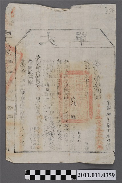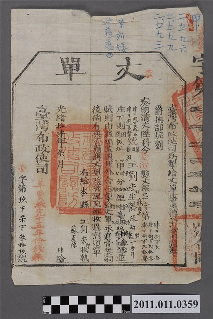 2011.011.0359 光緒14年臺灣布政使司給臺灣縣劉宏即蘇貞源丈單