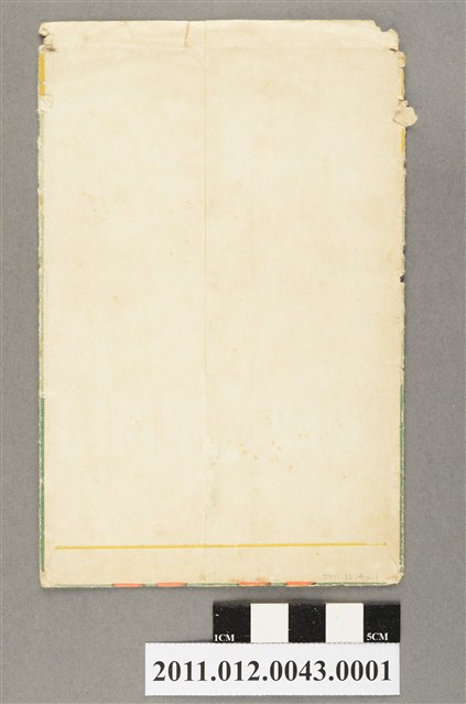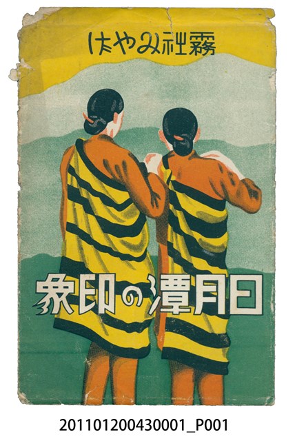 1.「日月潭的印象」明信片封套,採多色印刷,封面為圖繪二名披著紅黃相間橫條紋披肩婦女的背影,背景為層層的山巒,上有「霧社みやげ、日月潭の印象」等字。背面為無字。 2.封面圖繪是依登錄號2011.012.0043.0008的影像而繪製。