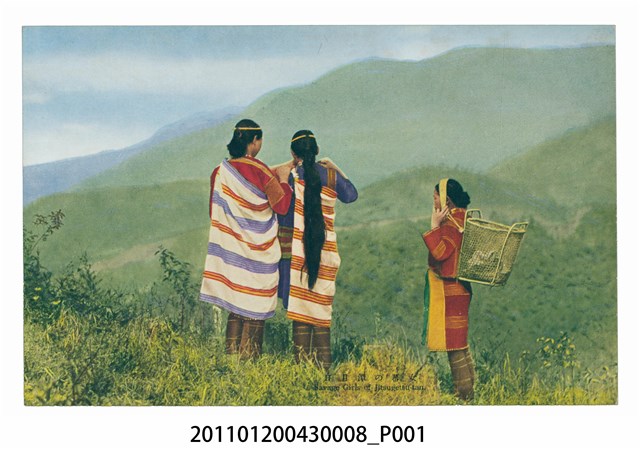 1.「日月潭的印象」系列明信片之一,多色印刷,影像內容為三名原住民婦女望著遠山的背影,左二人頭上戴有頭箍,披有條紋披肩,中間長髮女子似吹奏著口簧琴,右方女子以頭帶方式背著背籃側身,三人皆穿著傳統服飾,腳上綁有綁腿。依其服飾推測,可能為賽德克族或泰雅族人。