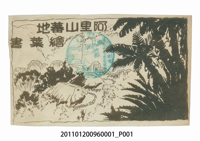 1. 本物件為以阿里山為主題的明信片封套。正面為阿里山的繪圖,中央有原住民居住之草屋,與兩個原住民(一大人一孩童)。左上方印「阿里山蕃地繪葉書」。背面空白,四周有裁剪的痕跡。2. 阿里山鄉位於嘉義縣東部,是嘉義縣面積最大的鄉鎮,也是嘉義縣唯一的山地鄉。阿里山鄉舊時一直為鄒族之固有領土,分屬許多部落。日治時期,日本政府為了開採檜木而興建了阿里山森林鐵路。