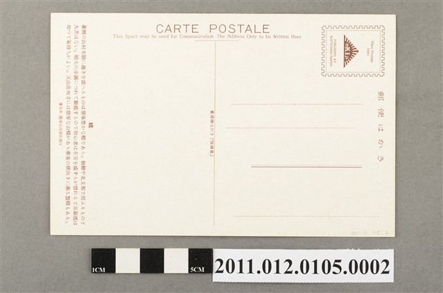 1. 本物件是以臺灣風景為主題的明信片。正面為扛轎的彩色圖片,中間為兩頂轎子,各由兩名轎夫扛著,右方有一臺汽車。背書為書寫面,右上角為郵票黏貼處,為一邊緣為鋸齒的四方形,內有「Place Postage Here」、「PUBLISHED BY KATSUYAMATAIPEH」字樣,中間有一三角形商標,印有「K.I.」、「特許」字樣。右側印「郵便はかき」。上方印「CRATE POSTALE」、「This Space may be used for Communication」、「The Adress Only to be Written Here」。中間有一T形分隔線,左側印「臺灣繪はがき『情緒篇』」。書寫地址處有虛線供對齊。左側為「轎」、「臺灣の山村水廓に趣きを添へるものは情味豊かな轎である。朝鮮や北支那で用ふるものと大差はない。轎夫の歩調につれて動搖するの初心者は不安を感ずるが慣れると其動搖は却つて氣持ちがよい。又山岳地方には簡單に山轎があり乘客の橫向きに乘る蟹轎もある。」(讓人感到趣味,臺灣山村味道濃厚的是轎子。跟朝鮮、華北地區使用的沒有什麼太大區別。轎夫的步調可能會使第一次搭的人感到不安,但若習慣了,就會感到開心。山區則有山轎,因為乘客是橫著坐的,又稱蟹轎。)「臺北市(榮)菊元百貨店發行」。2. 菊元百貨位於臺北町榮町,為臺灣第一家百貨公司,由日人重田榮治於西元1932年11月28日成立,12月3日開幕。與臺南的林百貨為臺灣日治時期的南北兩大百貨。3. 蟹轎為臺灣早期的一種特殊交通工具,多在偏遠地區使用,構造簡單,僅由一根竹竿加上懸掛藤篇或竹編之座椅,因乘客橫坐其上,有如螃蟹橫行,故稱蟹轎。