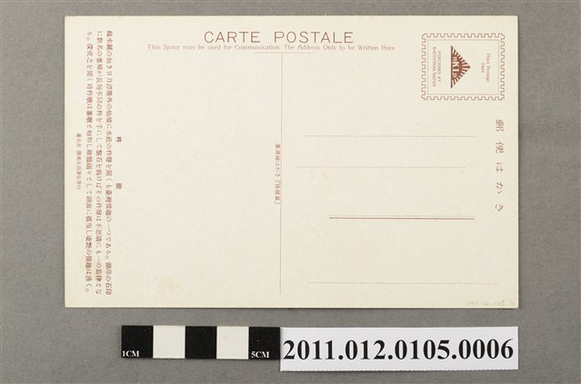 1. 本物件為以臺灣風景為主題的明信片。正面為杵歌的彩色圖片,十幾名婦女手持杵棒,圍成一圈。潭邊有數艘停靠著的小船。背書為書寫面,右上角為郵票黏貼處,為一邊緣為鋸齒的四方形,內有「Place Postage Here」、「PUBLISHED BY KATSUYAMATAIPEH」字樣,中間有一三角形商標,印有「K.I.」、「特許」字樣。右側印「郵便はかき」。上方印「CRATE POSTALE」、「This Space may be used for Communication」、「The Adress Only to be Written Here」。中間有一T形分隔線,左側印「臺灣繪はがき『情緒篇』」。左側為「杵歌」、「綠水鏡の如き日月潭塵外の仙境に水社の杵聲を聞くも臺灣情趣の一つである。湖岸の石印に數名の蕃婦が長短不同の杵を手にして盤石を搗けばその杵聲は不思議にも一の旋律となる。深夜之を聞く時杵歌は蕃歌と相和し餘韻嫋々として湖面に搖曳し淒豔の情趣は湧く。」(在綠水如鏡的日月潭、像塵世外的仙境,可以聽到水社的杵聲,也是種臺灣情趣。湖岸的石印社有數名番婦,手持長短不同的杵,在磐石上搗著,這種不可思議的杵聲並不只有一種旋律。在深夜聽到時,杵歌與番歌相和的餘韻在湖面嫋嫋搖曳,湧現出淒豔的情趣)、「臺北市(榮)菊元百貨店發行」。2. 菊元百貨位於臺北町榮町,為臺灣第一家百貨公司,由日人重田榮治於西元1932年11月28日成立,12月3日開幕。與臺南的林百貨為臺灣日治時期的南北兩大百貨。3. 杵音是邵族歌舞的特色,起源於舂米勞動,每支杵因其長短粗細不同,各自成音,以杵擊石,稱為杵聲,伴以歌聲與舂擊動作,便成杵音。