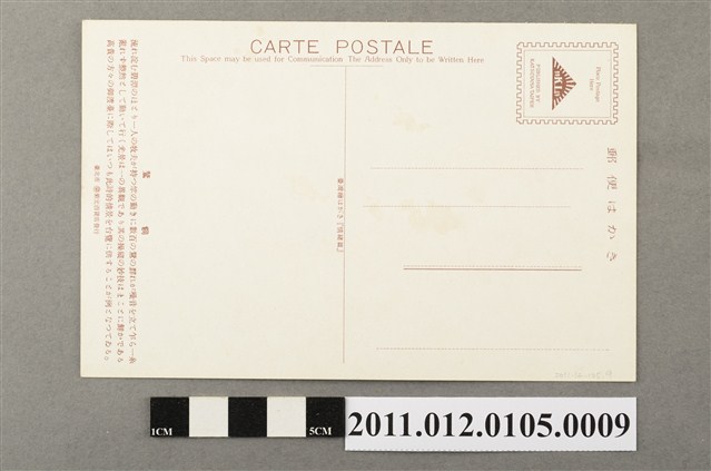 1. 本物件為以臺灣風景為主題的明信片。正面為飼養鴨子的彩色圖片,左方有一群鴨子,右方則有一名男子乘著小船。後方的山間可以見到寺廟。背書為書寫面,右上角為郵票黏貼處,為一邊緣為鋸齒的四方形,內有「Place Postage Here」、「PUBLISHED BY KATSUYAMATAIPEH」字樣,中間有一三角形商標,印有「K.I.」、「特許」字樣。右側印「郵便はかき」。上方印「CRATE POSTALE」、「This Space may be used for Communication」、「The Adress Only to be Written Here」。中間有一T形分隔線,左側印「臺灣繪はがき『情緒篇』」。左側印「鶩飼」、「流れ淀む碧潭のほとり一人の牧夫が持つ竿の動きに數百の鶩の群れが噪音を立て作ら一糸亂れず整然として動いて行く光景は一の異觀であり其の操縱の妙技はまことに鮮かである高貴の方々の御渡臺に際してはいつも此詩の情景を台覽に供することが例となつてゐる。」(在水流緩慢的碧潭上,那位牧人手裡的竹竿搖動時,數百隻的鴨群也隨著喧鬧地飛了起來,一絲不亂、井然有序地移動的情景,也是一種奇觀。這種操竿的巧妙技術,實在是漂亮。當年高貴的殿下渡臺時,也曾參觀這如詩的情景。)、「臺北市(榮)菊元百貨店發行」。2. 菊元百貨位於臺北町榮町,為臺灣第一家百貨公司,由日人重田榮治於西元1932年11月28日成立,12月3日開幕。與臺南的林百貨為臺灣日治時期的南北兩大百貨。