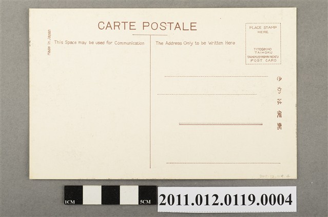2.正面影像黑白、四周留白邊,下方印有文字「新參道 石燈籠」,左下角蓋有「臺灣神社參拜記念、昭和8年2月3日」字樣的16瓣菊紋戳印,菊心為臺灣總督府「台」字標誌。背面則印有棕色文字「郵便はかき、CARTE POSTALE、Made in Japan」,郵票黏貼方框內有「PLACE STAMP HERE、TITOSeCHO TAIHOKU、TAIHOKUSYASHIN INSATU、POST CARD」等字。