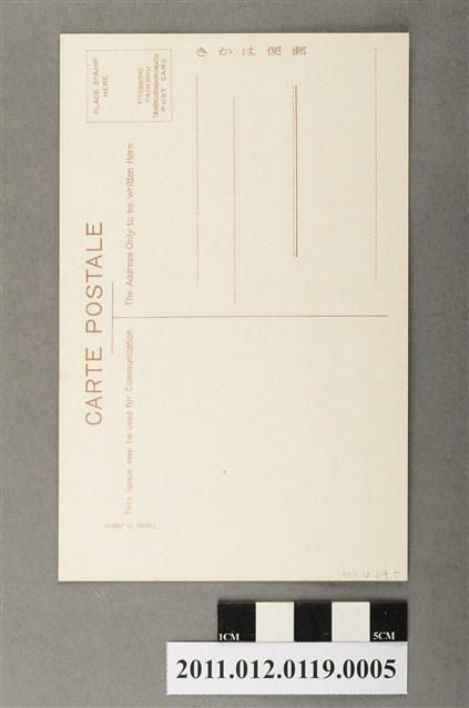 2.正面影像黑白、四周留白邊,下方印有文字「皇太子殿下御手植油杉」,左上角蓋有「臺灣神社參拜記念、昭和8年2月3日」字樣的16瓣菊紋戳印,菊心為臺灣總督府「台」字標誌。背面則印有棕色文字「郵便はかき、CARTE POSTALE、Made in Japan」,郵票黏貼方框內有「PLACE STAMP HERE、TITOSeCHO TAIHOKU、TAIHOKUSYASHIN INSATU、POST CARD」等字。