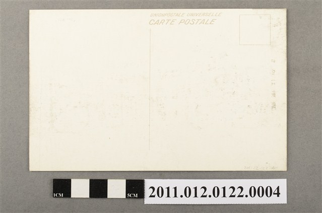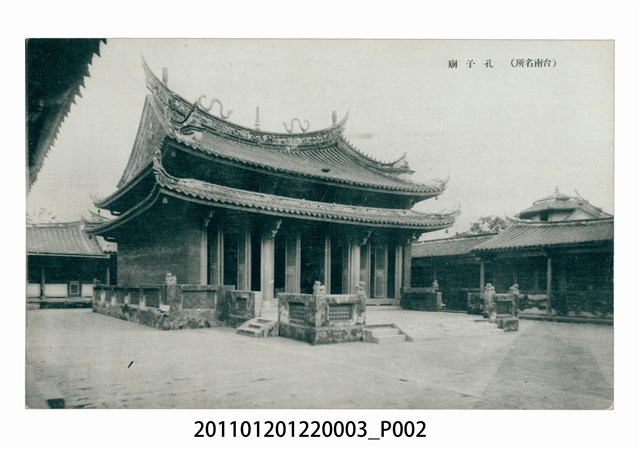 1.本物件為臺南孔廟的風景明信片。正面為孔廟大成殿的照片,建築立於臺基之上,屋頂為重簷歇山頂,正脊中央有九層寶塔,兩端各有1個藏經筒,九層寶塔至藏經筒間,各有1條龍。大成殿左後方建築為典籍庫,右方建築為禮樂庫,右前方建築為東廡。照片右上角由左而右印刷「(臺南名所) 孔子廟」等字。明信片背面中央繪製1條豎線,線條上方右側以斜體字書寫「UNIONPOSTALE UNIVERSELLE」法文,為萬國郵政聯盟之意,法文下方書寫「CARTE POSTALE」,為明信片之法文;明信片右上角繪有方框;明信片最右側以呈90度由右而左書寫「郵便はがき」,為日文明信片之意。2.西元1665年鄭成功的參軍陳永華建議鄭經後設立臺南孔廟,1685年清巡道周昌在此營建作為臺灣府學,並建築大成殿及東西兩廳,並設立欞星門與啟聖祠。1889年設全臺首學匾,1917年改築後與現代格局大抵相同,分別有大成殿、東西兩廊、崇聖祠、欞星門、明倫堂、文昌閣、名宦祠、節孝祠、泮池、禮門、義路等建築物。因本處為全臺儒學之先,故稱「全臺首學」。