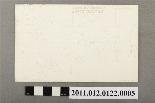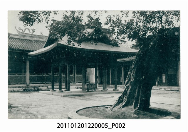 1.本物件為開山神社的風景明信片。正面為開山神社的照片,照片中央為拜殿,為唐風形式的木造建築,木造建築前為廣場,照片近景為廣場前1棵大樹;兩側有廂房;照片左下角由右而左以反白字印「(臺南名所)開山神社」。明信片背面中央繪製1條豎線,線條上方右側以斜體字書寫「UNIONPOSTALE UNIVERSELLE」法文,為萬國郵政聯盟之意,法文下方書寫「CARTE POSTALE」,為明信片之法文;明信片右上角繪有方框;明信片最右側以呈90度由右而左書寫「郵便はがき」,為日文明信片之意。2.神社於臺灣的興建,與殖民政府想透徹的進行皇民化運動有關。臺灣地區神社暴增於西元1936至1940年間,即是配合皇民化運動之進行。開山神社位於今臺南市中西區,清領時期為開臺聖王廟;1875年沈葆楨奏請朝廷改稱其為延平郡王廟(又稱延平郡王祠),主奉鄭成功;1897年日本殖民政府欲利用鄭成功之母為日本人田川氏此點,供奉鄭成功及其母親,以彰顯日本於臺灣統治的正當性,故將此改為開山神社,列為縣社。目前中央正殿設有鄭成功塑像與神位,左為甘輝將軍、右為張禮將軍,後殿祭祀其生母田川氏,左殿為監王祠祀有鄭克塽,右殿則為寧靖祠,祀有寧靖王及其五妃。