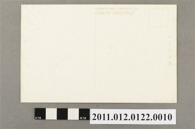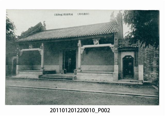 1.本物件為臺南州立博物館的風景明信片。正面為博物館照片,照片主景為建築,是由三座並列的建築組成,中央建築較高,屬廣東式建築格局。照片上方中央空白處以黑字由右而左印有「(臺南名所) 兩廣會館(博物館)」等字樣。明信片背面中央繪製1條豎線,線條上方右側以斜體字書寫「UNIONPOSTALE UNIVERSELLE」法文,為萬國郵政聯盟之意,法文下方書寫「CARTE POSTALE」,為明信片之法文;明信片右上角繪有方框;明信片最右側以呈90度由右而左書寫「郵便はがき」,為日文明信片之意。2.臺南州立博物館建築原為清治時期1877年設立的兩廣會館,為清末廣東、廣西兩省人士在臺之會館。日治初期遭日本政府徵用為辦公廳舍,1922年成為臺南州立教育博物館。建築在二次大戰末期遭盟軍轟炸損毀。