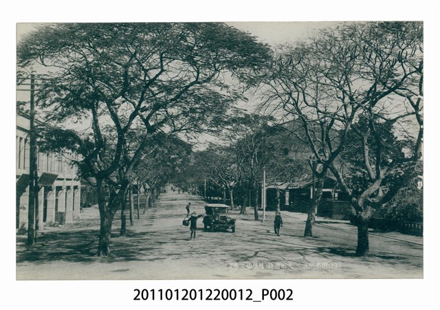 1.本物件為臺南大正通的風景明信片。正面為大正通街景照,照片中央為道路,道路中央有1輛車行駛,並有行人行走。中央道路兩旁種有鳳凰木行道樹,行道樹與兩側商店中間形成步道,有行人及腳踏車。兩側商店均為洋樓建築,有亭仔腳設計。照片下方偏右空白處以反白字由右而左印有「(臺南名所) 大正道路(鳳凰樹並木)」字樣。明信片背面中央繪製1條豎線,線條上方右側以斜體字書寫「UNIONPOSTALE UNIVERSELLE」法文,為萬國郵政聯盟之意,法文下方書寫「CARTE POSTALE」,為明信片之法文;明信片右上角繪有方框;明信片最右側以呈90度由右而左書寫「郵便はがき」,為日文明信片之意。2.大正通為今日臺南市的中山路,為臺南州廳通往臺南車站的要道。1916年町名改正,將臺南車站至大正公園(今湯德章紀念公園)一帶區域劃為大正町,大正通為主要幹道。路兩側種植的鳳凰木是臺南市的市樹,為其主要特色。