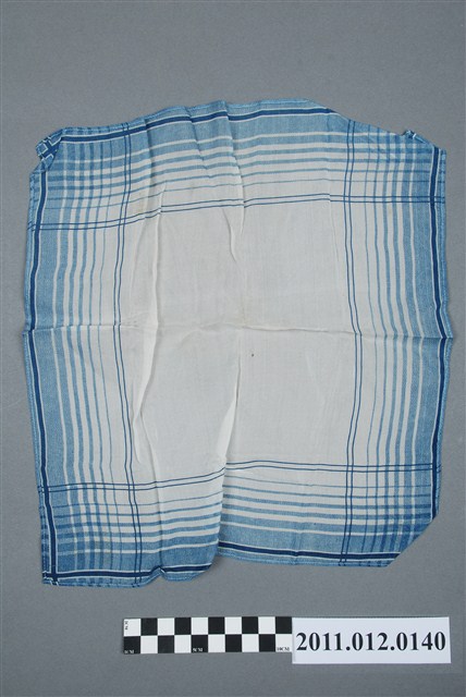本物件為一條手帕,以白色為基底,並以漸層的藍色線條裝飾,越外側藍色越深,除此之外為白色,無明顯使用痕跡,亦無法多作其餘年代或製造者的判斷。