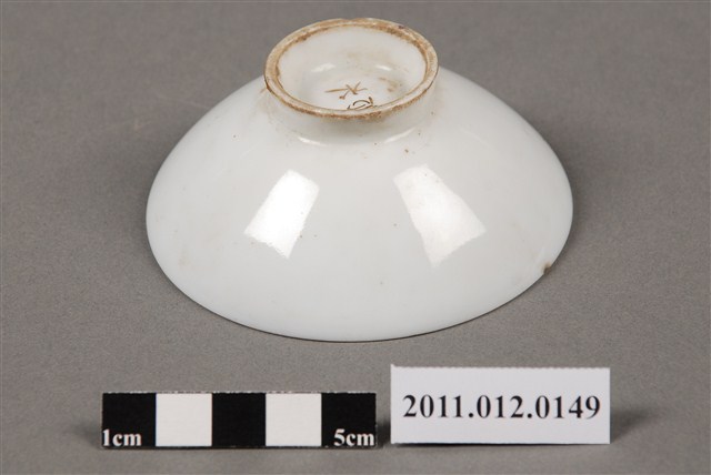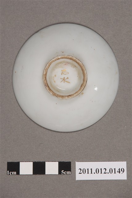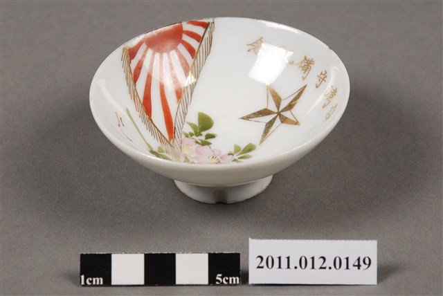 1.本物件為臺灣守備紀念瓷杯,紀念碑型製類似日本小酒杯,寬口但容量淺,慈悲內部有紋飾,分別有星星、日本國旗與櫻花,還有文字「臺步ニノニ」,杯底有「志水」二字。