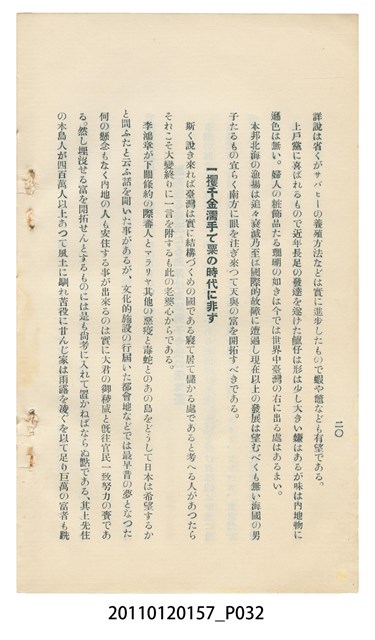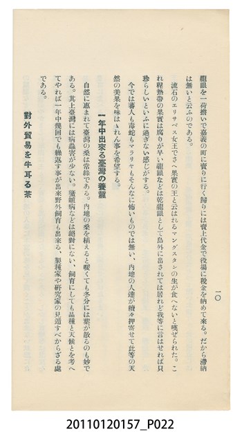 2.日本領有臺灣後,做為日本的殖民地,臺灣與殖民母國便成為一個經濟圈,由殖民母國提供資本、商品與移民,臺灣則提供原料與糧食,如米、糖等重要商品為最大宗,茶、樟腦則作為特產品供給日本。而在供給日本的同時,臺灣也作為日本的商品轉運地與日本工業品的市場,生產力與出口量皆較當時同為殖民地的朝鮮要來的高,臺灣市場的重要性可見一斑。
