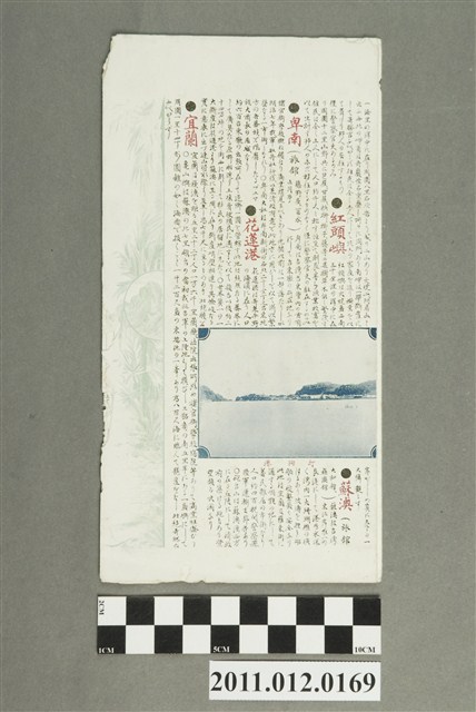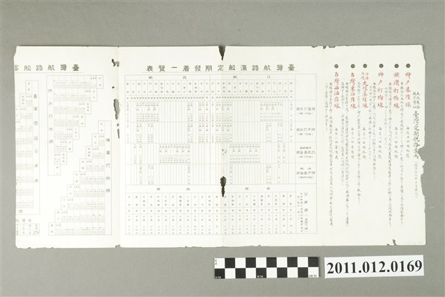 本物件為〈大阪商船株式會社臺灣定期航路案內〉,由大阪商船株式會社發行,略有破損但不影響閱讀,其中一面記載了臺灣與日本數港口的船班往來時刻表,包含神戶基隆線、橫濱打狗線、臺灣東西海岸線、神戶打狗線等。另一面有各港口的基本介紹,如橫濱、神戶、鹿兒島、基隆、八重山、鳳山、安平、花蓮港等地。