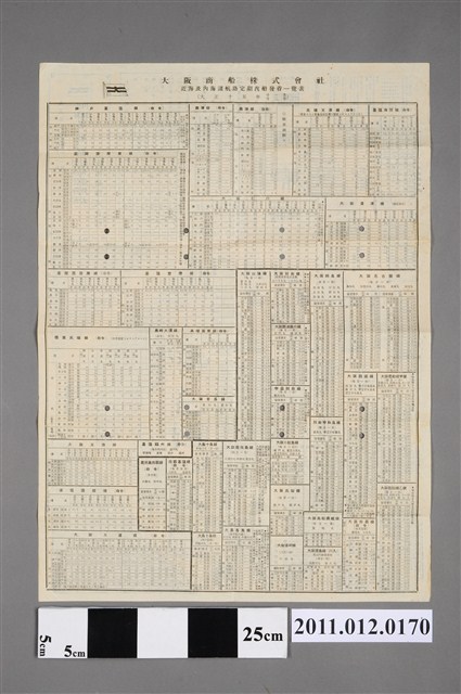本物件為〈大阪商船株式會社近海內地各航路時刻定期發著表船客運貨表〉,由大阪商船株式會社發行於大正15年,正反兩面皆有航班表。