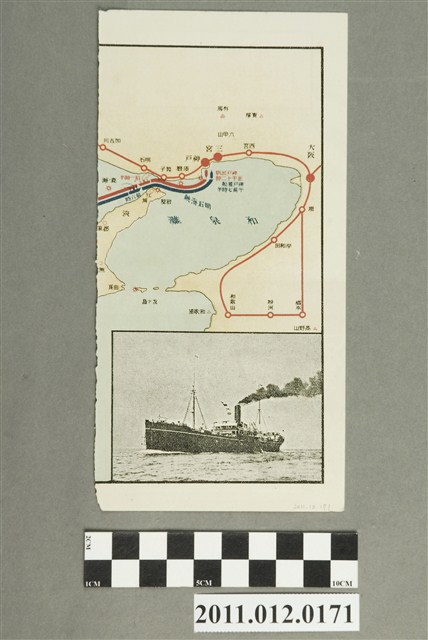 本物件為臺灣航路案內,由日本郵船株式會社發行,封面畫著一名西裝男子與一名孩童站在海邊,因摺頁僅剩一頁,僅可見到背面的部分內容,是大阪、神戶一帶的地圖,下方有一輪船圖片。