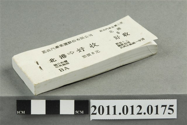 1.本物件為嘉義汽車客運股份有限公司北港至好收全票,整本共有多張,票價為8元,寫有「隔日作廢」、「切角無效」等注意事項,以及「三民主義統一中國」等標語。