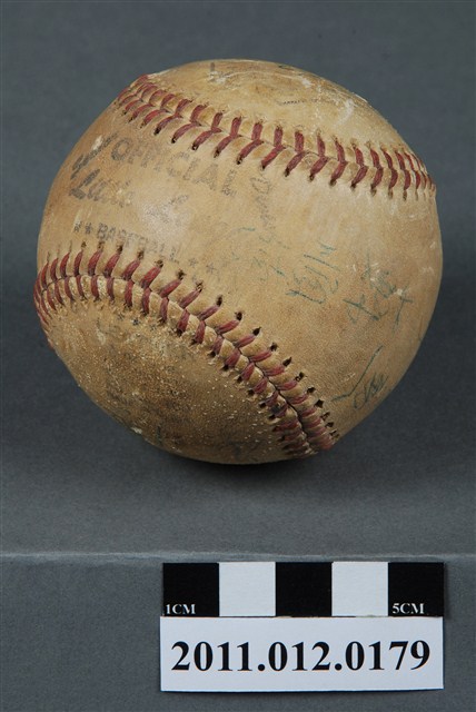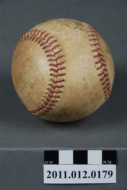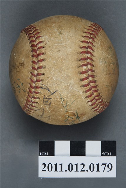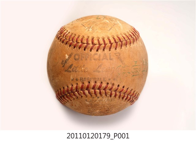 1.本物件為西元1974年世界青少棒賽紀念球,表面材質為牛皮,球皮上有「OFFICIAL Little League BASEBALL」字樣以及教練宋宦勳、經理曾紀恩,選手高文川、張永昌、蘇順德等人原子筆簽名筆跡,球皮有泛黃痕跡。